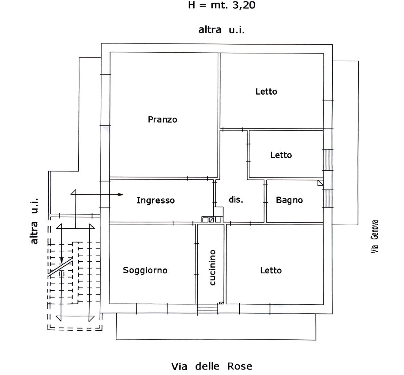 Appartamento di mq 138 posto al primo piano di una villetta bifamiliare, dotato di ascensore privato. L’abitazione è composta da: ingresso, ampio salone, soggiorno, cucinino, disimpegno, due camerette, camera da letto e bagno.